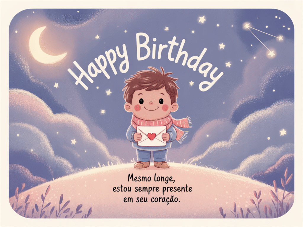 Text Mesmo longe, estou sempre presente em seu coração Flat cute cartoon-style illustration of a smiling boy holding a letter with a heart on it, standing on a hill under a starry night sky. Soft and pastel tones of blue, pink, and white dominate the scene. Floating stars, a glowing moon, and little clouds surround the character, enhancing the dreamy atmosphere. Handwritten playful font for the text. Warm and heartfelt ambience, perfect for a long-distance birthday message.